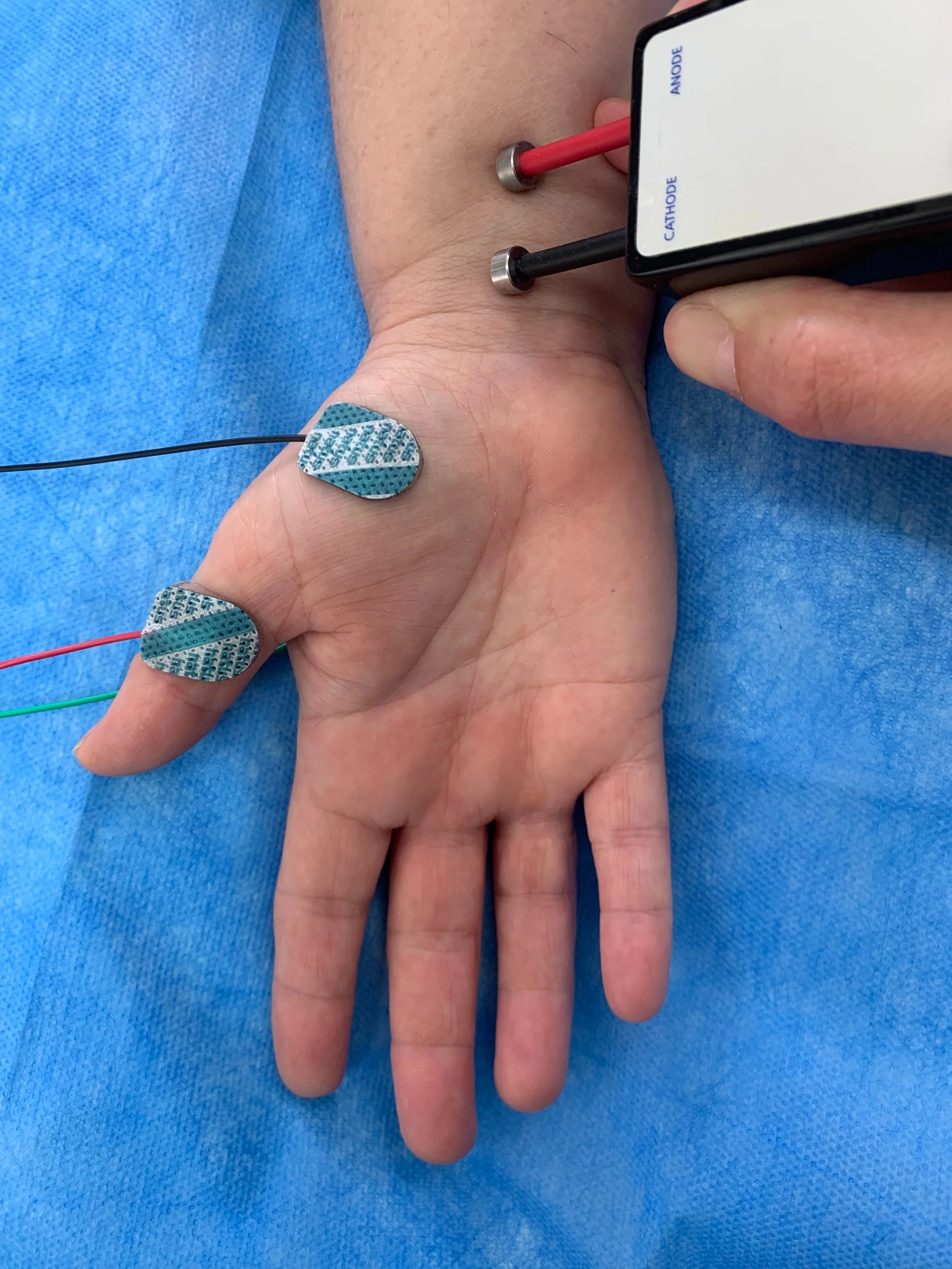 A nerve conduction study is an electrical test of the nerves. Electrodes are applied to the hands or feet and small electrical impulses are given at various sites along the limbs.